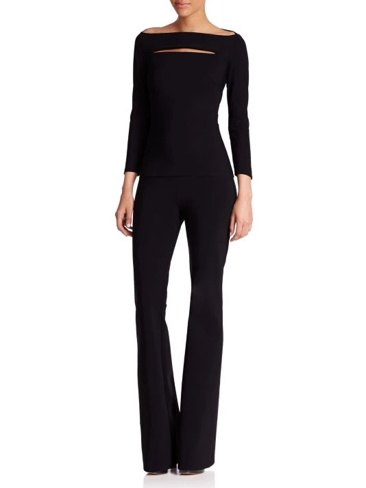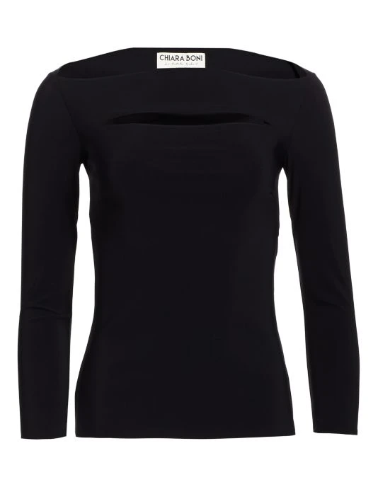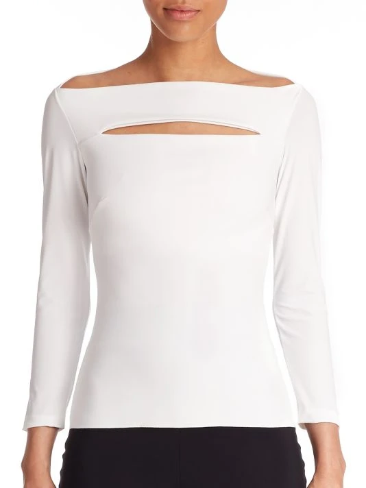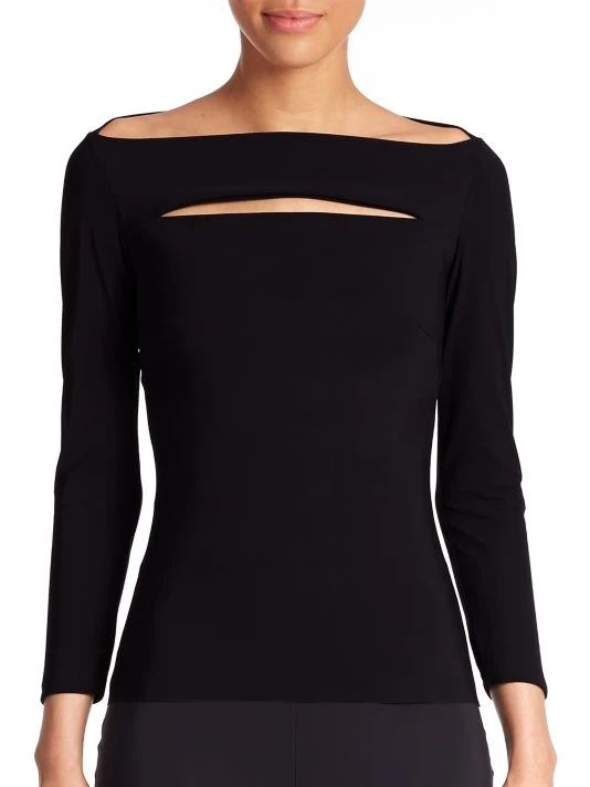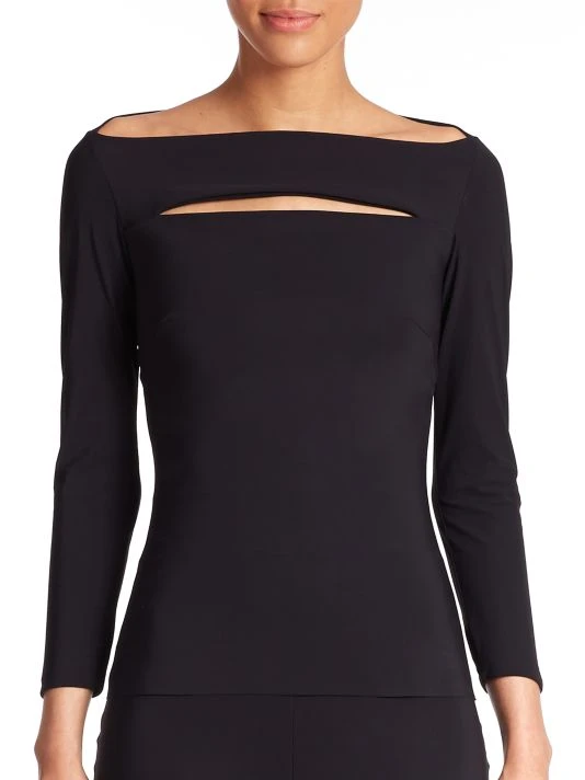 A demure boatneck top with three-quarter sleeves, rendered in stretch jersey, gets a dose of edgy styling with a slit across the bodice.