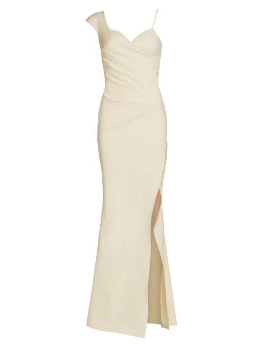 ONLY AT SAKS. From a one-shoulder detail and contrasting spaghetti strap, this dress falls to an elegantly wrapped bodice and front-slit skirt.