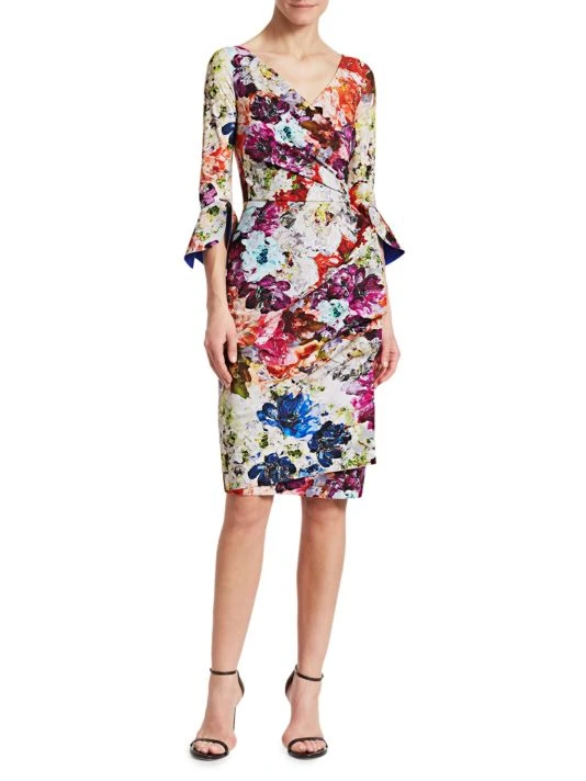 A painterly floral print adorns this ruched ruffle-sleeve wrap dress.